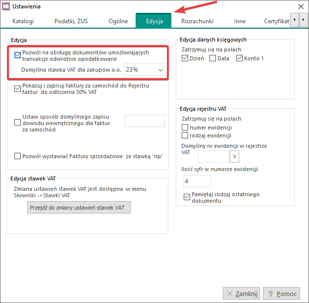 Aby w programie Ala zaksięgować dokumenty dotyczące transakcji odwrotnie opodatkowanych, należy zaznaczyć w menu Ustawienia->zakładka: Edycja parametr: Pozwól na obsługę dokumentów umożliwiających transakcje odwrotnie opodatkowane.