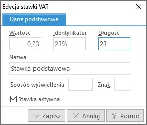 W menu Opcje->Słowniki->Stawki VAT wprowadzono predefiniowane stawki VAT, w których użytkownik może edytować wybrane dane, np.: aktywność stawki, długość dla wydruku oraz nazwę.