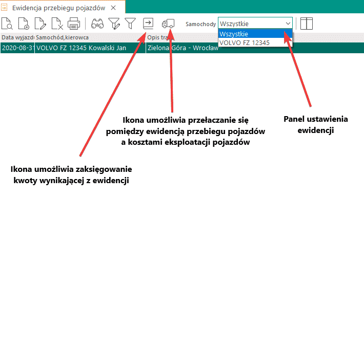 Ewidencja przebiegu pojazdu pozwala na rozliczanie kosztów eksploatacji oraz prowadzenie ewidencji przebiegu samochodów (o pojemności do 900 cm3 i powyżej 900 cm3), a także motocykli. Opcję Ewidencji przebiegu pojazdów można włączyć korzystając z głównego paska menu Księgowość->Ewidencja przebiegu pojazdów lub za pomocą kombinacji klawiszy <Ctrl+E>. Istnieje również możliwość włączenia tej opcji poprzez ikonę