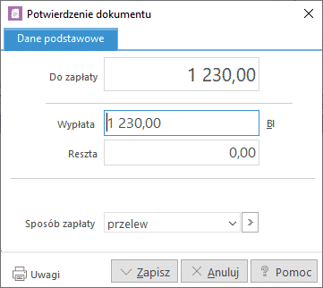 Z okna Potwierdzenie dokumentu można użyć kombinacji klawiszy <Ctrl+Shift+K>, która umożliwi wywołanie kalkulatora wydawania reszty w przypadku zapłaty gotówką.